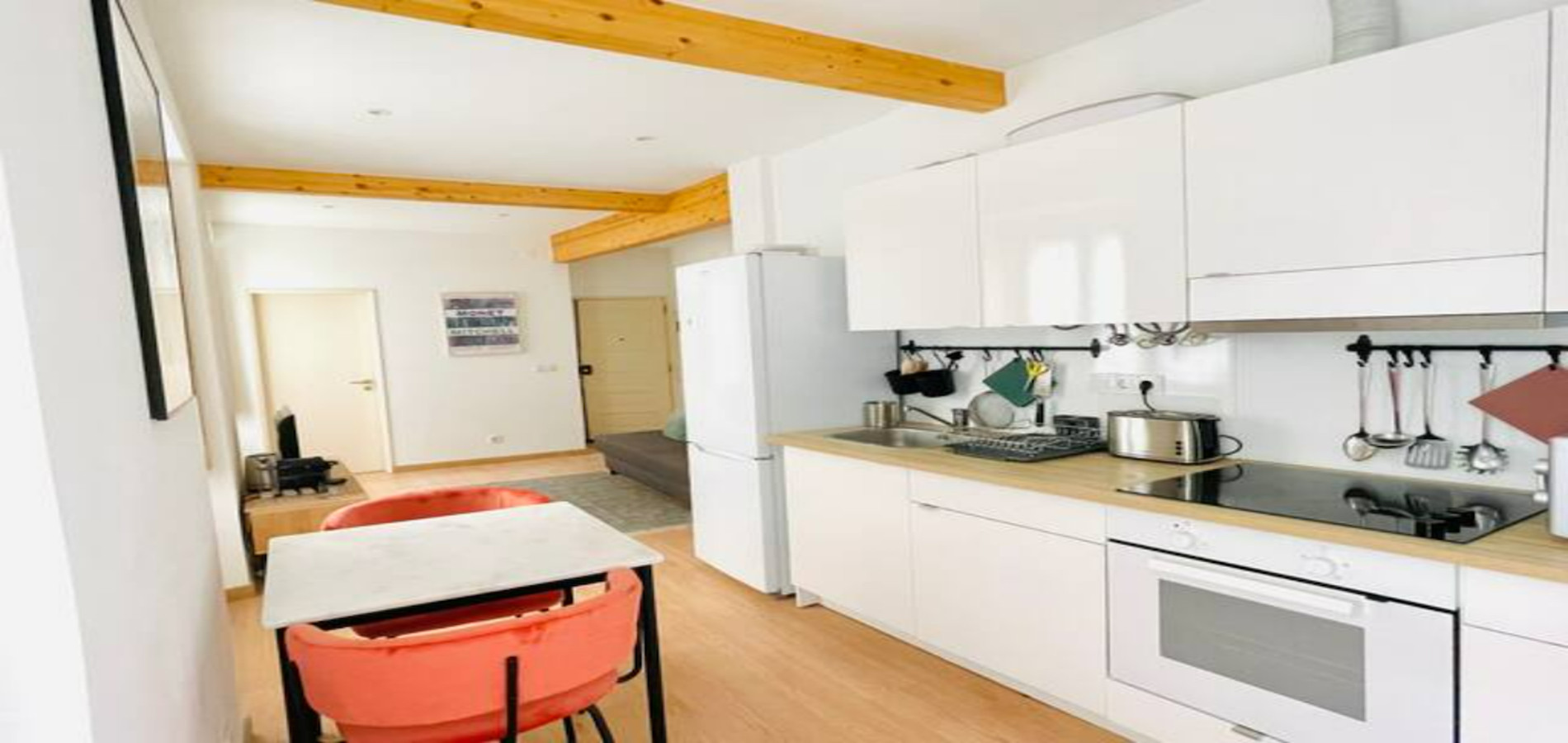 This renovated apartment from 2022 has about 30 m² and includes a living room, one bedroom, a fully equipped kitchen, and a bathroom! It also has A/C!